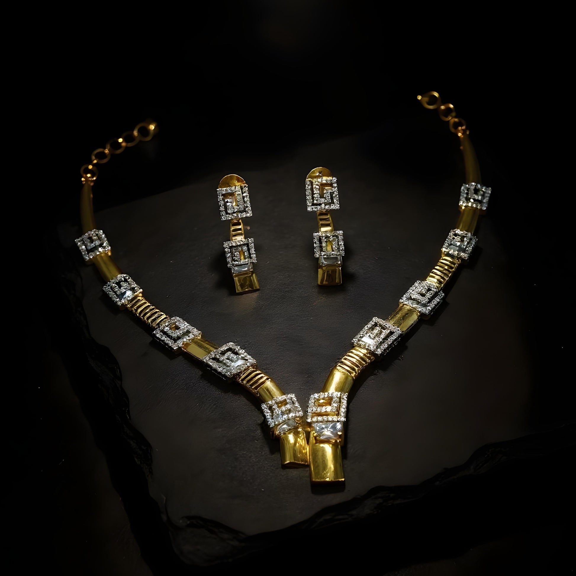 Adira represents strength and beauty in perfect harmony. This bold necklace set, adorned with radiant American diamonds, is for the confident woman who commands attention.